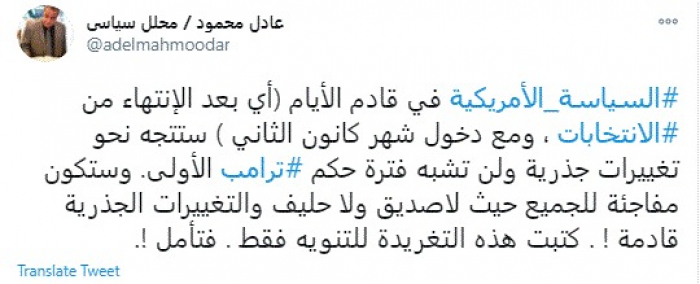 وكتب في تغريدة عبر "تويتر" رصدها "المشهد العربي": "السياسة الأمريكية في قادم الأيام (أي بعد الانتهاء من الانتخابات، ومع دخول شهر كانون الثاني) ستتجه نحو تغييرات جذرية ولن تشبه فترة حكم ترامب الأولى".