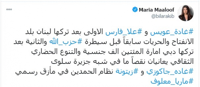 وكتبت في تغريدة عبر "تويتر" رصدها "المشهد العربي": "غادة عويس وعلا فارس الأولى بعد تركها لبنان بلد الانفتاح والحريات سابقاً قبل سيطرة حزب الله والثانية بعد تركها دبي إمارة المئتين ألف جنسية والتنوع الحضاري الثقافي يعانيان نقصاً ما في شبه جزيرة سلوى غاده جاكوزي وزيتونة نظام الحمدين في مأزق رسمي".
