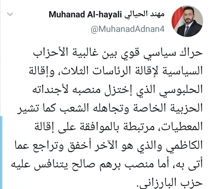 وقال الحيالي في تغريدة له عبر حسابه بتويتر ورصدها "المشهد العربي" : "حراك سياسي قوي بين غالبية الأحزاب السياسية لإقالة الرئاسات الثلاث، وإقالة الحلبوسي الذي اختزل منصبه لأجنداته الحزبية الخاصة وتجاهل الشعب".