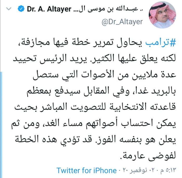 وقال الطاير على حسابه بتويتر ورصدها "المشهد العربي" :"ترامب يحاول تمرير خطة فيها مجازفة، لكنه يعلق عليها الكثير. يريد الرئيس تحييد عدة ملايين من الأصوات التي ستصل بالبريد غدا، وفي المقابل سيدفع بمعظم قاعدته الانتخابية للتصويت المباشر بحيث يمكن احتساب أصواتهم مساء الغد، ومن ثم يعلن هو بنفسه الفوز".