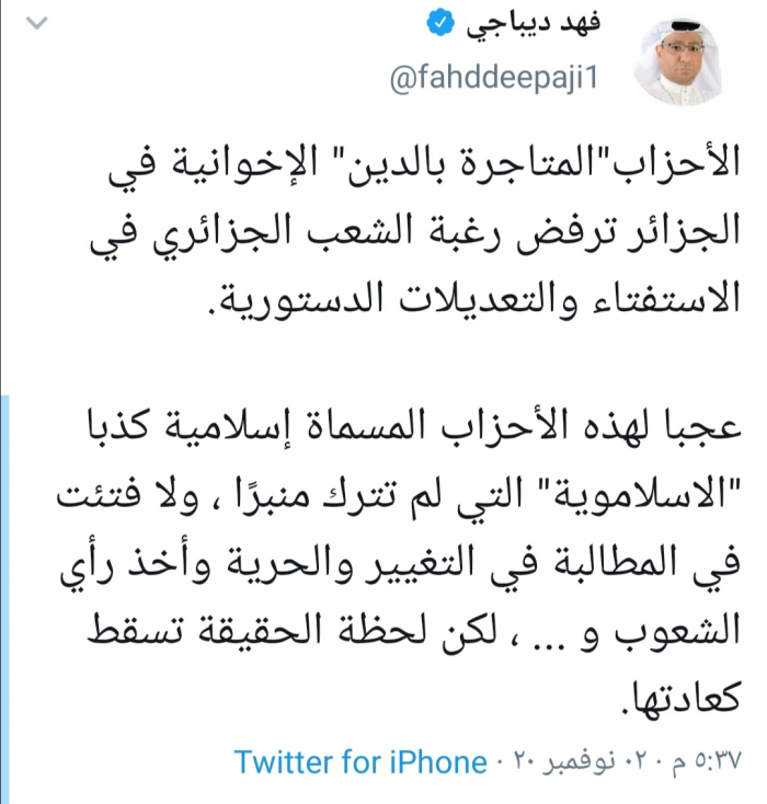 وقال ديباجي عبر حسابه في تويتر ورصدها "المشهد العربي": "الأحزاب"المتاجرة بالدين" الإخوانية في الجزائر ترفض رغبة الشعب الجزائري في الاستفتاء والتعديلات الدستورية".