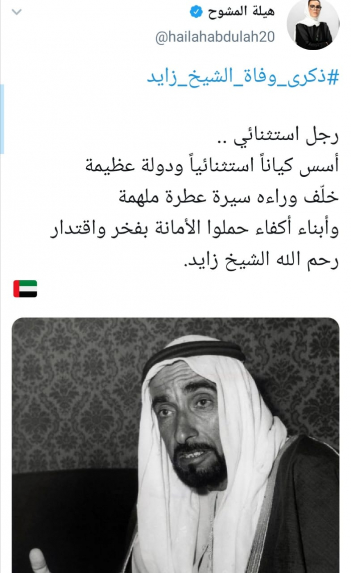 غردت الإعلامية السعودية هيلة المشوح، في #ذكرى_وفاة_الشيخ_زايد وقالت إنه كان رجل استثنائي.