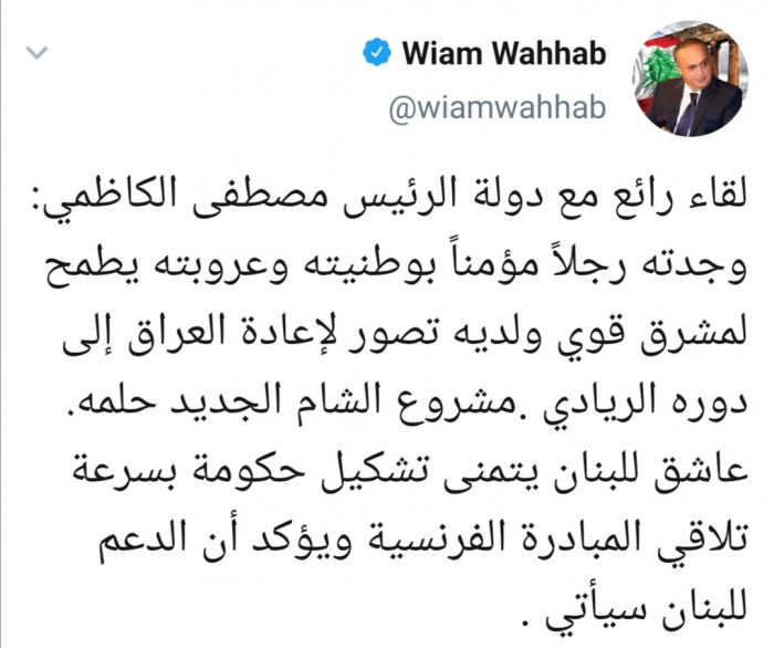 أشاد السياسي اللبناني البارز وئام وهاب، برئيس الحكومة العراقية مصطفى الكاظمي بعد اللقاء الذي جمعهما.