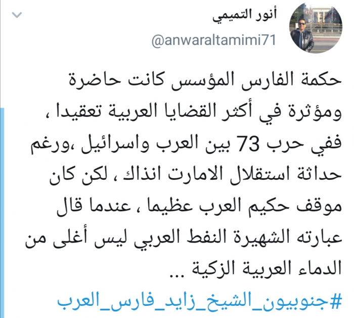 وقال التميمي في تغريدة له عبر حسابه بتويتر ورصدها "المشهد العربي": "حكمة الفارس المؤسس كانت حاضرة ومؤثرة في أكثر القضايا العربية تعقيدا ، ففي حرب 73 بين العرب واسرائيل، ورغم حداثة استقلال الإمارات آنذاك، لكن كان موقف حكيم العرب عظيما، عندما قال عبارته الشهيرة النفط العربي ليس أغلى من الدماء العربية الزكية".