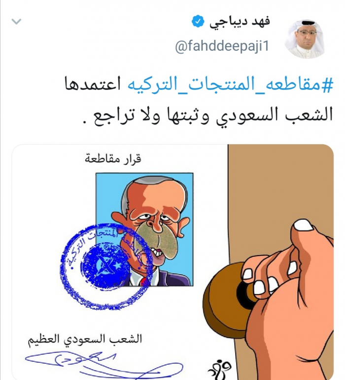 وقال ديباجي عبر حسابه في تويتر ورصدها "المشهد العربي": "#مقاطعةالمنتجاتالتركية اعتمدها الشعب السعودي وثبتها ولا تراجع".