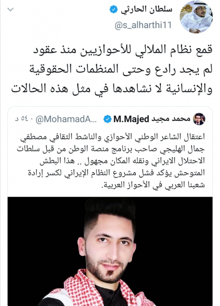 هاجم الإعلامي السعودي سلطان الحارثي، نظام الملالي الإيراني بسبب عدائه للشعب الأحوازي بين قتل وخطف النشطاء.