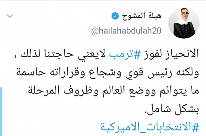 وقالت المشوح عبر حسابها بتويتر رصدها " المشهد العربي": "الانحياز لفوز ترمب لايعني حاجتنا لذلك ، ولكنه رئيس قوي وشجاع وقراراته حاسمة ما يتوائم ووضع العالم وظروف المرحلة بشكل شامل".