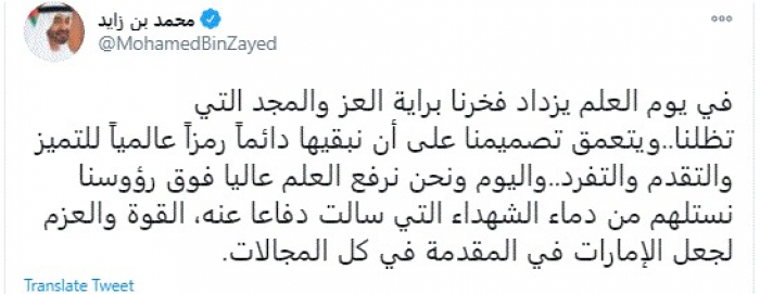 وقال في تغريدة عبر "تويتر" رصدها "المشهد العربي": "في يوم العلم يزداد فخرنا براية العز والمجد التي تظلنا..ويتعمق تصميمنا على أن نبقيها دائماً رمزاً عالمياً للتميز والتقدم والتفرد..واليوم ونحن نرفع العلم عاليا فوق رؤوسنا نستلهم من دماء الشهداء التي سالت دفاعا عنه، القوة والعزم لجعل الإمارات في المقدمة في كل المجالات".