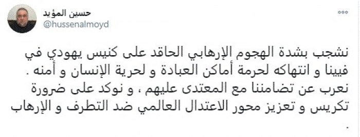 وقال في تغريدة عبر "تويتر" رصدها "المشهد العربي": "نشجب بشدة الهجوم الإرهابي الحاقد على كنيس يهودي في فيينا وانتهاكه لحرمة أماكن العبادة ولحرية الإنسان وأمنه".