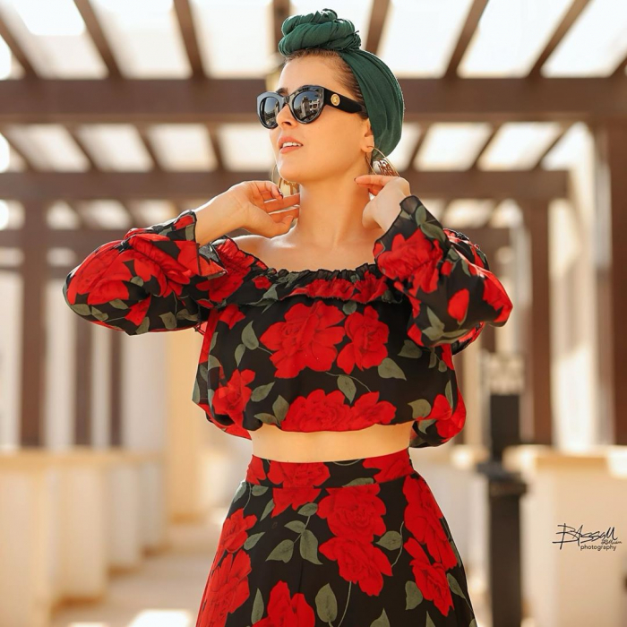 وظهرت عائشة في الصور بإطلالة أنيقة وسط الطبيعة.