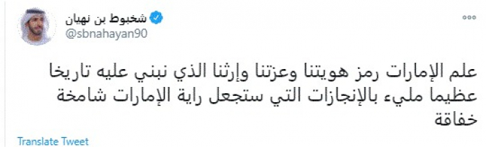 وكتب في تغريدة عبر "تويتر" رصدها "المشهد العربي": "علم الإمارات رمز هويتنا وعزتنا وإرثنا الذي نبني عليه تاريخا عظيما مليء بالإنجازات التي ستجعل راية الإمارات شامخة خفاقة".