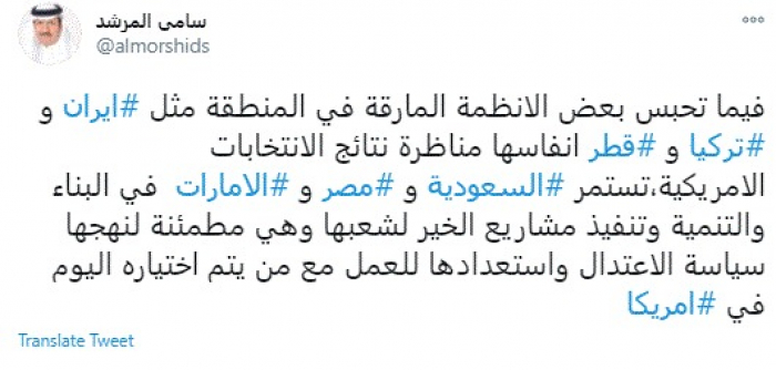 وكتب في تغريدة عبر "تويتر" رصدها "المشهد العربي": "فيما تحبس بعض الأنظمة المارقة في المنطقة مثل إيران وتركيا وقطر أنفاسها مناظرة نتائج الانتخابات الأمريكية، تستمر السعودية ومصر والإمارات في البناء والتنمية وتنفيذ مشاريع الخير لشعبها وهي مطمئنة لنهجها سياسة الاعتدال واستعدادها للعمل مع من يتم اختياره اليوم في أمريكا".