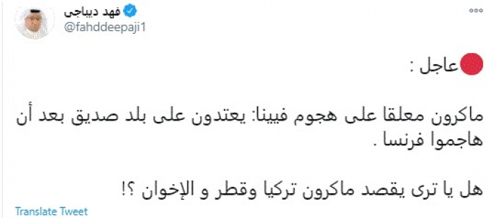 وقال في تغريدة عبر "تويتر" رصدها "المشهد العربي": "ماكرون معلقا على هجوم فيينا: يعتدون على بلد صديق بعد أن هاجموا فرنسا. هل يا ترى يقصد ماكرون تركيا وقطر والإخوان؟!".