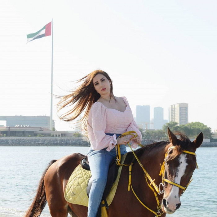 وظهرت نسرين طافش على الحصان ومن خلفها علم الإمارات، وعلقت على الصورة قائلة: "يا إمارات السعادة.. فرحه اعيادك زيادة .. فيك اوصاف الريادة .. زينك ربي ودام يوم العلم الاماراتي".