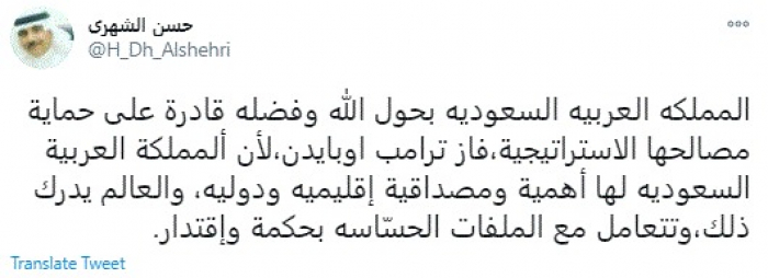 وكتب في تغريدة عبر "تويتر" رصدها "المشهد العربي": "المملكة العربية السعودية بحول الله وفضله قادرة على حماية مصالحها الاستراتيجية، فاز ترامب أو بايدن، لأن المملكة العربية السعوديه لها أهمية ومصداقية إقليمية ودولية، والعالم يدرك ذلك، وتتعامل مع الملفات الحسّاسه بحكمة وإقتدار".