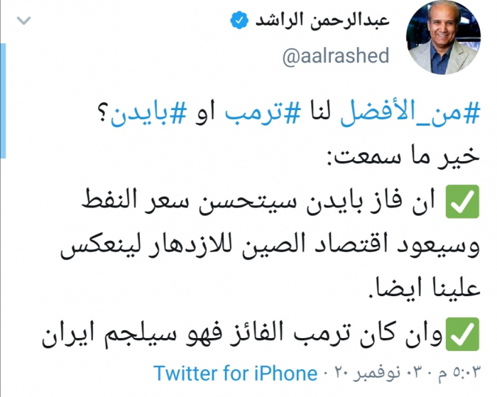 وقال الراشد في تغريدة له عبر حسابه بتويتر ورصدها "المشهد العربي": "من الأفضل لنا ترمب أو بايدن؟ مجيبا خير ما سمعت: أن "فاز بايدن سيتحسن سعر النفط وسيعود اقتصاد الصين للازدهار لينعكس علينا أيضا".
