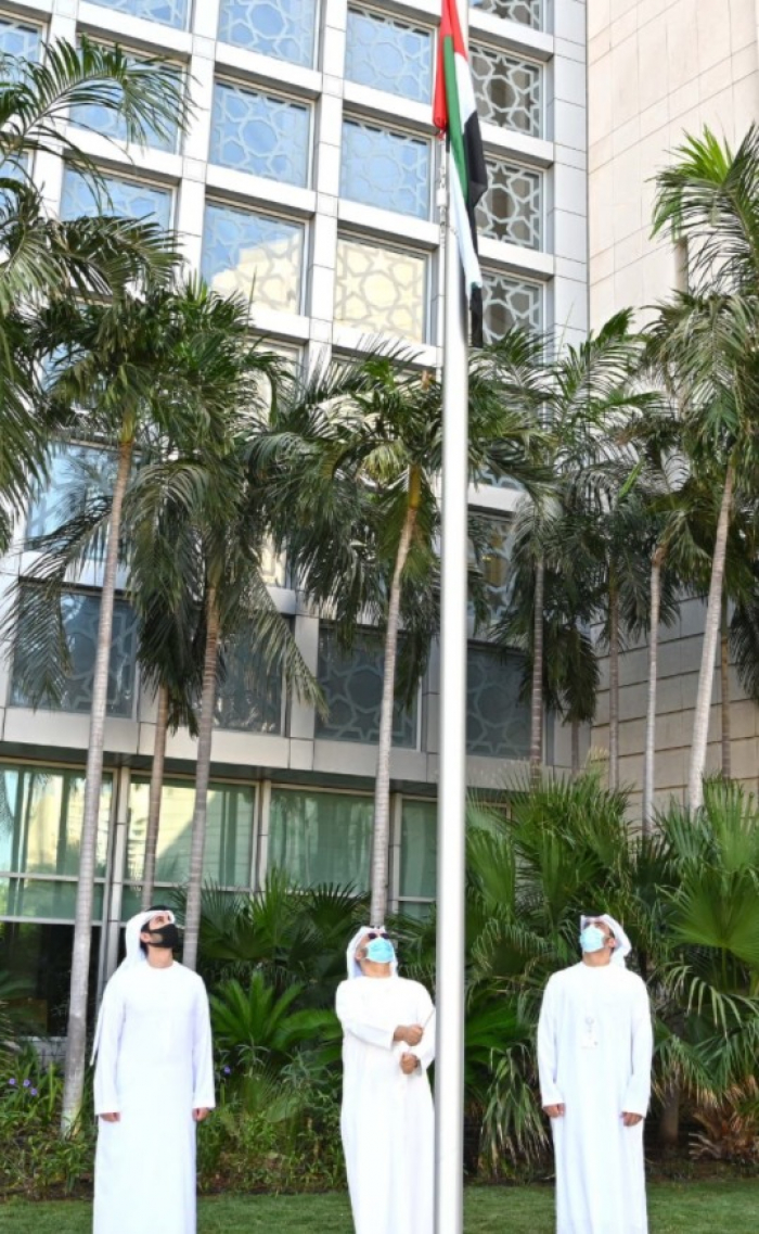 ورفع وزير الدولة للشؤون الخارجية الدكتور أنور بن محمد قرقاش علم الدولة على السارية الرئيسة في ديوان عام الوزارة بأبوظبي بحضور سعادة خالد عبدالله حميد بالهول وكيل وزارة الخارجية والتعاون الدولي وسعادة شهاب أحمد الفهيم وكيل وزارة مساعد لشؤون المراسم.