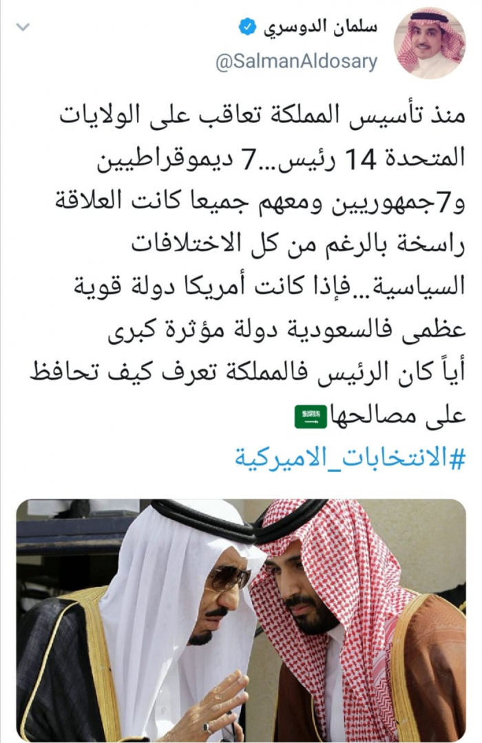 وقال الدوسري عبر تغريدة له على "تويتر" رصدها " المشهد العربي": "منذ تأسيس المملكة تعاقب على الولايات المتحدة 14 رئيس…7 ديموقراطيين و7جمهوريين ومعهم جميعا كانت العلاقة راسخة بالرغم من كل الاختلافات السياسية".