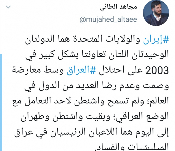وأضاف الطائي في تغريدة له عبر حسابه بتويتر ورصدها "المشهد العربي" : "لم تسمح واشنطن لأحد التعامل مع الوضع العراقي؛ وبقيت واشنطن وطهران إلى اليوم هما اللاعبان الرئيسيان في عراق الميليشيات والفساد".