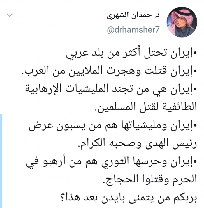 وأكد الشهري أن "إيران ومليشياتها هم من يسبون عرض رئيس الهدى وصحبه الكرام، وهي وحرسها الثوري هم من أرهبوا في الحرم وقتلوا الحجاج"، واختتم تغريدته "بربكم من يتمنى بايدن بعد هذا".