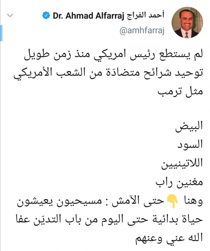 وقال الفراج عبر تغريدة له على حسابه بتويتر ورصدها "المشهد العربي" :"لم يستطع رئيس أمريكي منذ زمن طويل توحيد شرائح متضادّة من الشعب الأمريكي مثل ترمب" البيض، السود، اللاتينيين، مغنين راب".