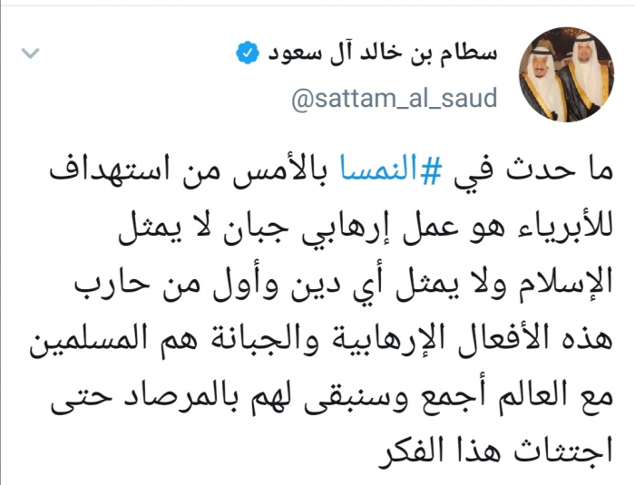 أكد الأمير السعودي سطام بن خالد آل سعود، أن ما حدث في النمسا بالأمس من استهداف للأبرياء هو عمل إرهابي جبان لا يمثل الإسلام ولا يمثل أي دين.