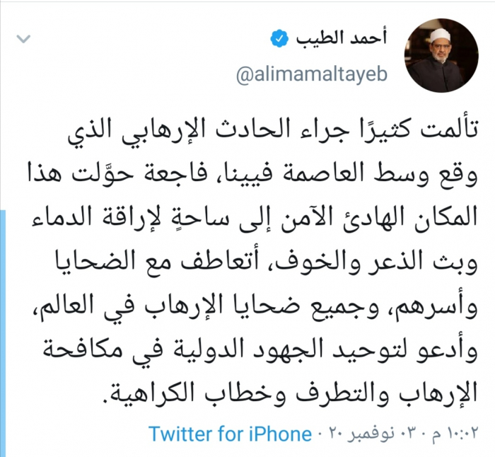 وقال الطيب في تغريدة له عبر حسابه بتويتر ورصدها المشهد العربي: " تألمت كثيرًا جراء الحادث الإرهابي الذي وقع وسط العاصمة فيينا، فاجعة حوَّلت هذا المكان الهادئ الآمن إلى ساحةٍ لإراقة الدماء وبث الذعر والخوف".