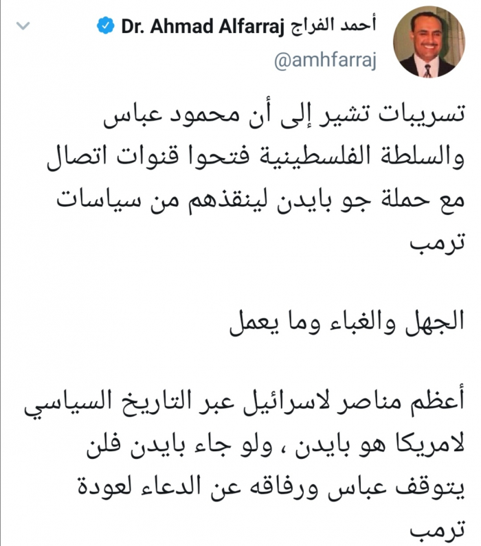 وقال الفراج عبر تغريدة له على حسابه بتويتر ورصدها "المشهد العربي" :"تسريبات تشير إلى أن محمود عباس والسلطة الفلسطينية فتحوا قنوات اتصال مع حملة جو بايدن لينقذهم من سياسات ترمب" معلقا: "الجهل والغباء وما يعمل".