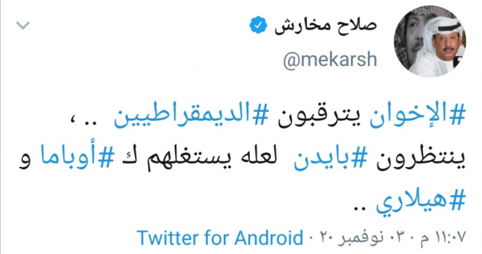 وقال مخارش في تغريدة له عبر حسابه بتويتر ورصدها المشهد العربي: "الإخوان يترقبون الديمقراطيين.. ينتظرون بايدن لعله يستغلهم كأوباما وهيلاري".