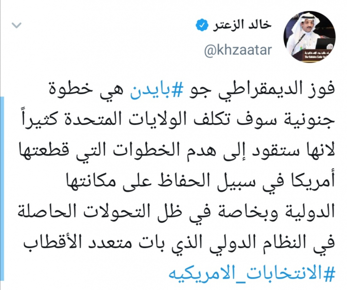 وقال الزعتر عبر تغريدة له على "تويتر" رصدها "المشهد العربي" : "فوز الديمقراطي جو بايدن هي خطوة جنونية سوف تكلف الولايات المتحدة كثيراً لأنها ستقود إلى هدم الخطوات التي قطعتها أمريكا في سبيل الحفاظ على مكانتها الدولية وبخاصة في ظل التحولات الحاصلة في النظام الدولي الذي بات متعدد الأقطاب".