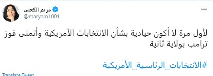 وقالت في تغريدة عبر "تويتر" رصدها "المشهد العربي": "لأول مرة لا أكون حيادية بشأن الانتخابات الأمريكية وأتمنى فوز ترامب بولاية ثانية".