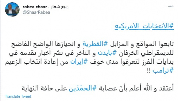 وقال في تغريدة عبر "تويتر" رصدها "المشهد العربي": "تابعوا المواقع والمزابل القطرية وانحيازها الواضح الفاضح للديمقراطي الخرفان بايدن والتأخر في نشر أخبار تقدمه في بدايات الفرز لتعرفوا مدى خوف إيران من إعادة انتخاب الزعيم ترامب!! اعتقد والله أعلم بأنّ عصابة الحمَدَين على حافة النهاية".