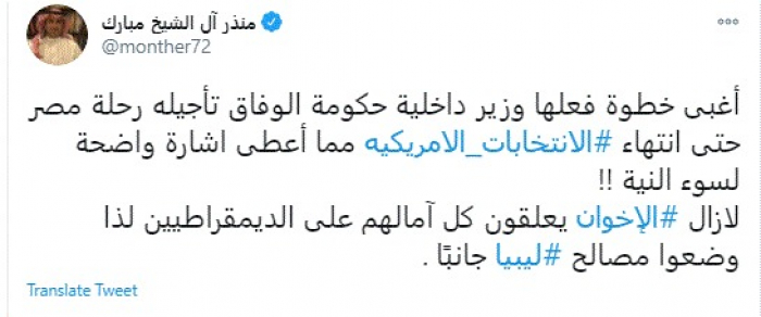 وقال في تغريدة عبر "تويتر" رصدها "المشهد العربي": "أغبى خطوة فعلها وزير داخلية حكومة الوفاق تأجيله رحلة مصر حتى انتهاء الانتخابات الأمريكية مما أعطى إشارة واضحة لسوء النية! لا زال الإخوان يعلقون كل آمالهم على الديمقراطيين لذا وضعوا مصالح ليبيا جانبًا".