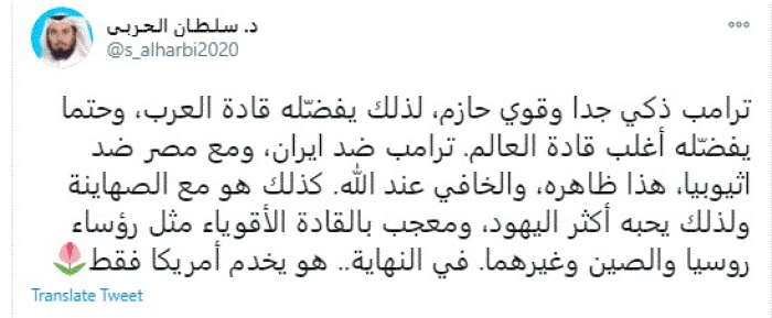 وقال في تغريدة عبر "تويتر" رصدها "المشهد العربي": "ترامب ذكي جدا وقوي حازم، لذلك يفضّله قادة العرب، وحتما يفضّله أغلب قادة العالم. ترامب ضد ايران، ومع مصر ضد اثيوبيا، هذا ظاهره، والخافي عند الله".