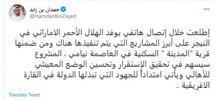 وقال في تغريدة عبر "تويتر" رصدها "المشهد العربي": "إطلعت خلال إتصال هاتفي بوفد الهلال الأحمر الإماراتي في النيجر على أبرز المشاريع التي يتم تنفيذها هناك ومن ضمنها قرية المدينة السكنية في العاصمة نيامي ، المشروع سيسهم في تحقيق الاستقرار وتحسين الوضع المعيشي للأهالي ويأتي امتداداً للجهود التي تبذلها الدولة في القارة الإفريقية".