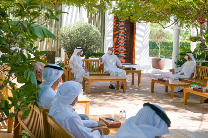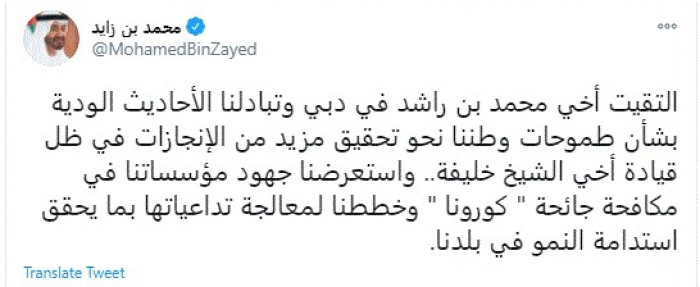 وقال في تغريدة عبر "تويتر رصدها "المشهد العربي": "التقيت أخي محمد بن راشد في دبي وتبادلنا الأحاديث الودية بشأن طموحات وطننا نحو تحقيق مزيد من الإنجازات في ظل قيادة أخي الشيخ خليفة".