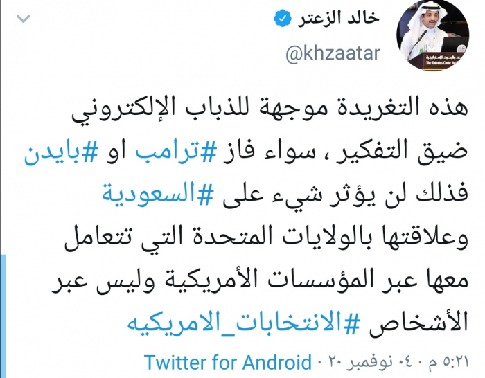 وقال الزعتر عبر تغريدة له على "تويتر" رصدها "المشهد العربي" : "هذه التغريدة موجهة للذباب الإلكتروني ضيق التفكير، سواء فاز ترامب أو بايدن فذلك لن يؤثر شيء على السعودية وعلاقتها بالولايات المتحدة التي تتعامل معها عبر المؤسسات الأمريكية وليس عبر الأشخاص".