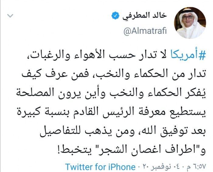 وقال المطرفي في تغريدة له عبر حسابه بتويتر ورصدها "المشهد العربي" :"أمريكا لا تدار حسب الأهواء والرغبات، تدار من الحكماء والنخب، فمن عرف كيف يُفكر الحكماء والنخب وأين يرون المصلحة يستطيع معرفة الرئيس القادم بنسبة كبيرة بعد توفيق الله".