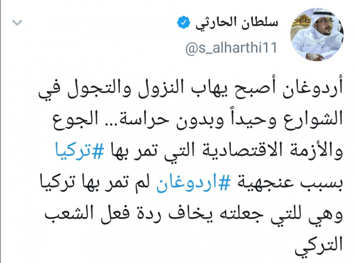 هاجم الإعلامي السعودي سلطان الحارثي، الرئيس التركي رجب طيب أردوغان، بسبب عنجهيته والأزمة الاقتصادية التي ورط فيها بلاده.