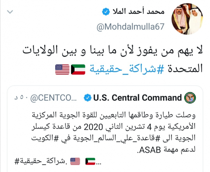 وكتب الملا في تغريدة له عبر حسابه بتويتر ورصدها "المشهد العربي": "لا يهم من يفوز لأن ما بينا و بين الولايات المتحدة شراكة حقيقية".