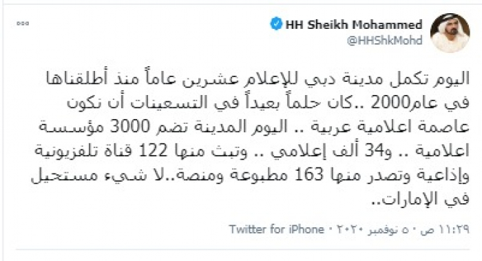 وكتب "بن راشد" تغريدة عبر حسابه الرسمي في تويتر، رصدها "المشهد العربي": " اليوم تكمل مدينة دبي للإعلام عشرين عاما منذ أطلقناها في عام2000".
