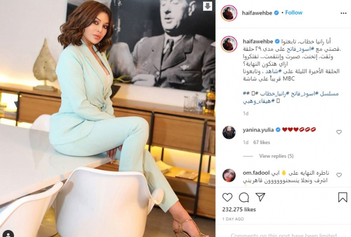 وتألقت هيفا بلوك مكون من سروال وجاكيت وانتعلت صاندالاً ذهبي اللون بكعب عالٍ، وزادها إشراقاً شعرها القصير البني المتموّج، وعلقت قائلة:"أنا رانيا خطاب، تابعتوا قصتي مع اسود فاتح على مدى 29 حلقة. وثقت، إتخنت، صبرت وإنتقمت... تفتكروا ازاي هتكون النهاية؟ الحلقة الأخيرة الليلة على شاهد، وتابعونا قريباً على شاشة MBC".