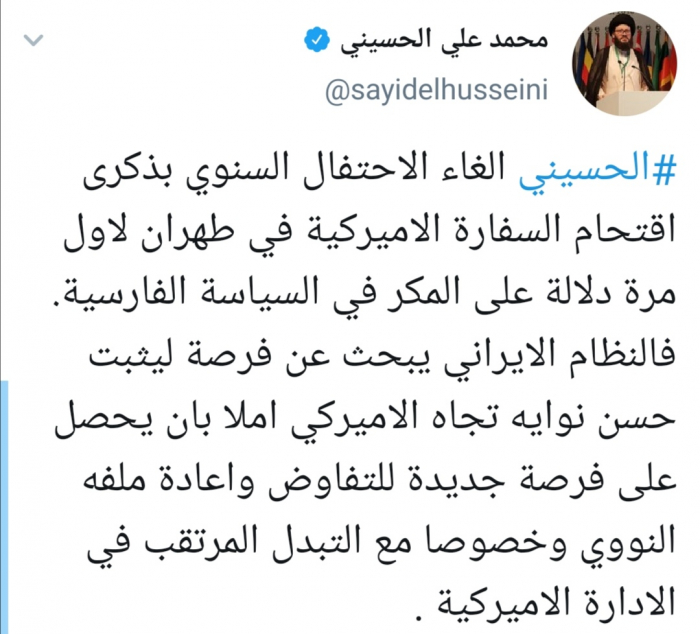 وقال الحسيني في تغريدة له عبر "تويتر" رصدها "المشهد العربي" أن "إلغاء الاحتفال السنوي بذكرى اقتحام السفارة الأميركية في طهران لأول مرة دلالة على المكر في السياسة الفارسية".