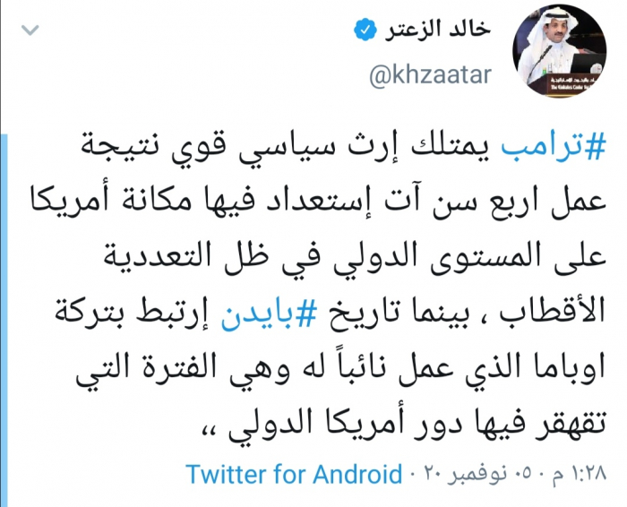 وقال الزعتر عبر تغريدة له على "تويتر" رصدها "المشهد العربي": "ترامب يمتلك إرث سياسي قوي نتيجة عمل أربع سن آت استعداد فيها مكانة أمريكا على المستوى الدولي في ظل التعددية الأقطاب، بينما تاريخ بايدن ارتبط بتركة أوباما الذي عمل نائباً له وهي الفترة التي تقهقر فيها دور أمريكا الدولي".