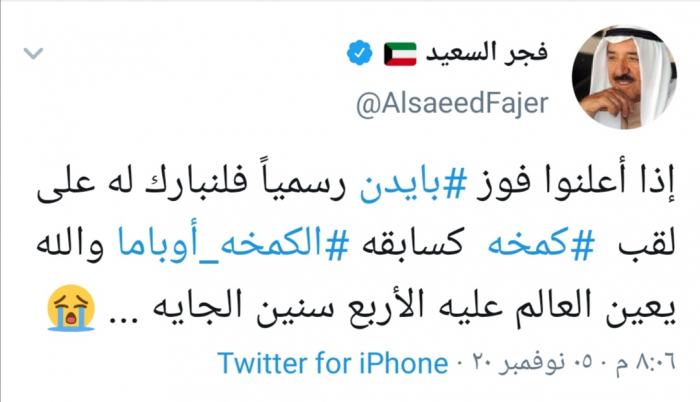 وقالت السعيد في تغريدة لها عبر حسابها بتويتر ورصدها المشهد العربي: "إذا أعلنوا فوز بايدن رسمياً فلنبارك له على لقب كمخة كسابقه الكمخة أوباما والله يعين العالم عليه الأربع سنين الجاية".