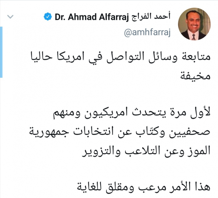 وقال الفراج عبر تغريدة له على حسابه بتويتر ورصدها "المشهد العربي" :"متابعة وسائل التواصل في امريكا حاليا مخيفة".