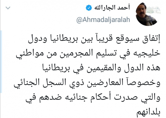 وقال الجار الله عبر تغريدة له على " تويتر" رصدها " المشهد العربي : "اتفاق سيوقع قريباً بين بريطانيا ودول خليجية في تسليم المجرمين من مواطني هذه الدول والمقيمين في بريطانيا وخصوصا المعارضين ذوي السجل الجنائي والتي صدرت أحكام جنائية ضدهم في بلدانهم".