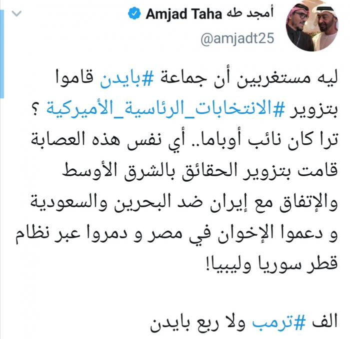 وأضاف طه في تغريدة له عبر حسابه بتويتر ورصدها "المشهد العربي": "ترا كان نائب أوباما.. أي نفس هذه العصابة قامت بتزوير الحقائق بالشرق الأوسط، والاتفاق مع إيران ضد البحرين والسعودية و دعموا الإخوان في مصر و دمروا عبر نظام قطر سوريا وليبيا".