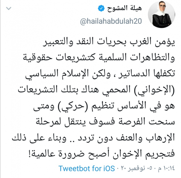 وكتبت المشوح عبر حسابها بتويتر رصدها " المشهد العربي": "يؤمن الغرب بحريات النقد والتعبير والتظاهرات السلمية كتشريعات حقوقية تكفلها الدساتير ، ولكن الإسلام السياسي (الإخواني) المحمي هناك بتلك التشريعات هو في الأساس تنظيم (حركي)".