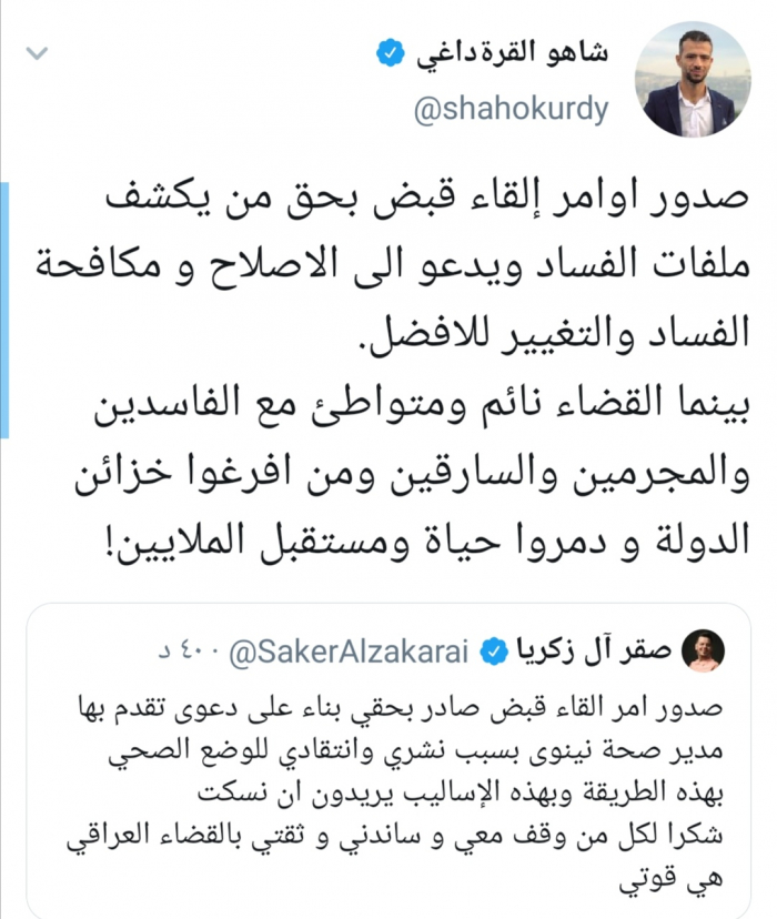 وقال القرة داغي عبر تغريدة له على "تويتر" رصدها " المشهد العربي": "صدور أوامر إلقاء قبض بحق من يكشف ملفات الفساد ويدعو إلى الإصلاح ومكافحة الفساد والتغيير للأفضل".